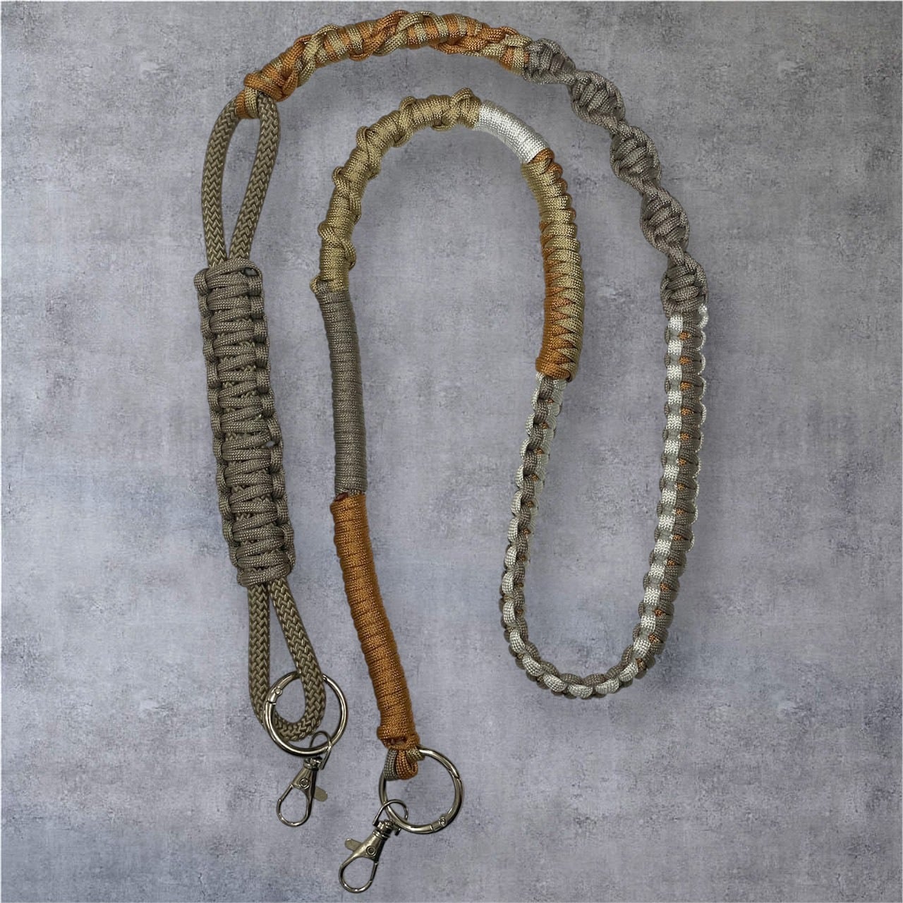 落ち着きのある色味のグレーをベースに3種類の色を使用したスマホショルダーです。 モノトーンに映えるライトグレーの立体的な編み模様が特徴。 シンプルだけど、どんなコーデにも馴染むデザインです。 先端の丸い金具(丸カン)の部分にキーケースや小物入れなどをつけることも可能です。 size : 125cm(金具込み) *配送料・お手入れ方法などの詳細についてはABOUTに記載していますので、一読いただけますようお願いいたします。