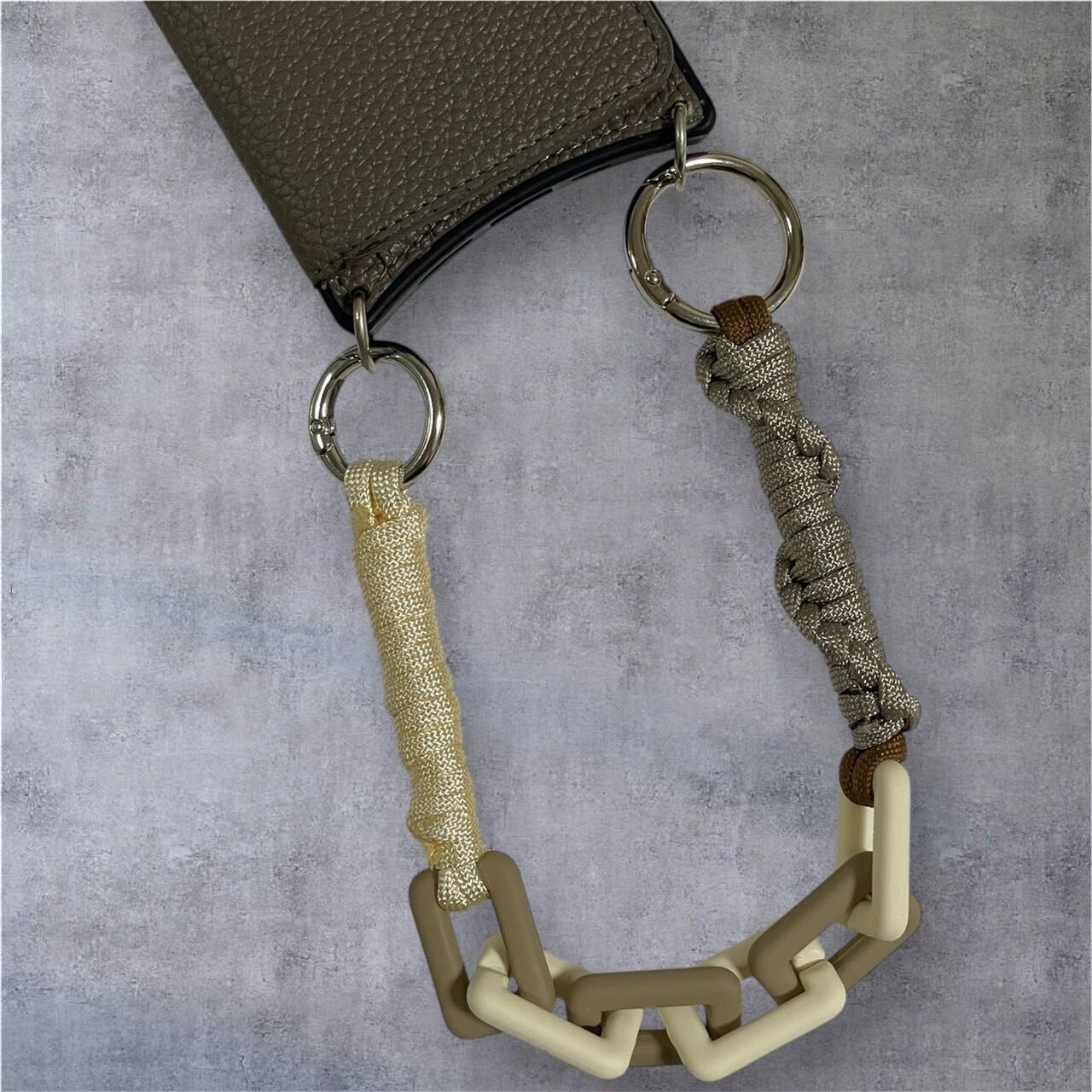 短い方はハンドバッグの取手やスマホのハンドショルダーとしても使用可能です。